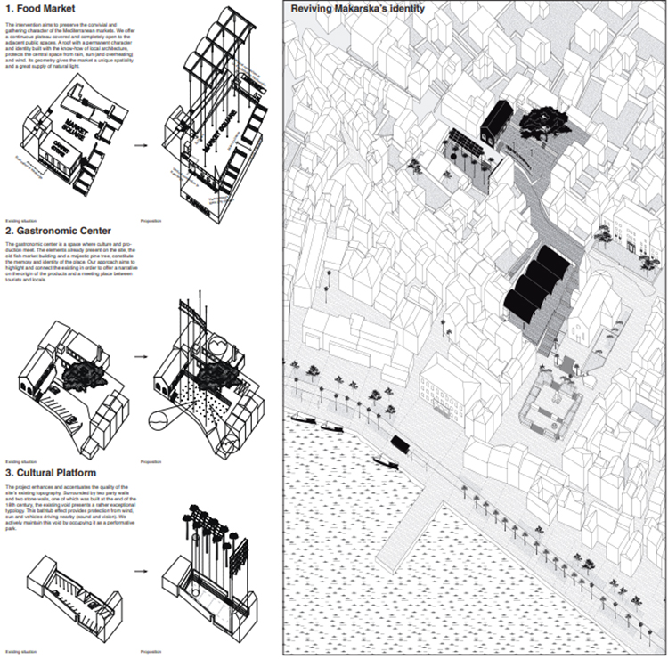 Za lokaciju koja se sastoji od tri javna prostora u središtu grada Makarske na natječaj je pristiglo 20 radova autorskih timova čiji članovi dolaze iz 15 europskih zemalja. Sedmeročlani međunarodni ocjenjivački sud ocjenjivao je radove na dva zasjedanja, održana u rujnu i studenome.