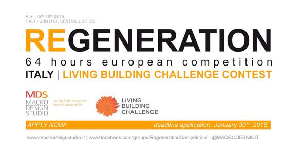 Makro Design Studio u suradnji s ILFI organizira REGENERATION 64 hours European Competition, prvi natječaj u dizajniranju u Europi u potpunosti temeljen na LBC protokolu. REGENERATION 64 hours European Competition okuplja prvu generaciju mladih stručnjaka (arhitekata, inžinjera) koji mogu svojim idejama „regenerirati“ te napraviti optimalna rješenja za okoliš i građevinski sektor.REGENERATION 64 hours European Competition će se održati u Centrale FIE, Dro (Trento - Italija), u periodu između 15-18. travnja, 2015. REGENERATION 64 hours European Competition je prvi natječaj u Europi u potpunosti temeljen na protokolu Living Building Challenge. Living Building Challenge™ (LBC) je program certificiranja zgrada, alat za zastupanje i filozofija koje definira najnaprednije metode i mjere održivosti u građevinskom sektoru.