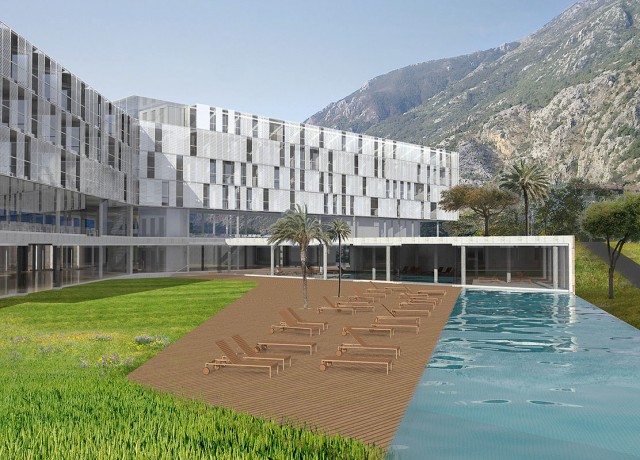 Smeštajni deo hotelskog korpusa lebdi nad arhitekturom kaskada i podzida obučentransparentnom i fluidnom opnom žaluzina, kako bi se dematerijalizovao i kako bi se obezbedile vizure prema moru za svaku smeštajnu jedinicu. Geometrija stambenog dela hotelskog korpusa je u obliku slova Y okrenutog prema moru zbog orijentacije soba, formirajući tako trougaoni višeetažni holski prostor, iz koga se otvaraju široke vizure prema dubini bokokotorskog bazena.