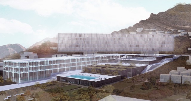 Funkcionalna šema namena sa složenom mrežom komunikacija, teren u konstantnom padu i fizička kompaktnost koju objekat zahteva zajedno oblikuju hotel u vidu kompleksnog prizemlja i smeštajnih jedinica na spratovima iznad i ispod.
