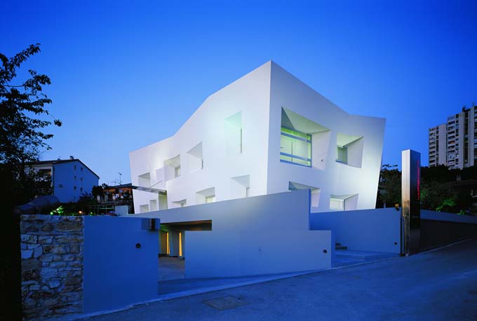 Činjenica da je kuća projektirana za dizajnera rasvjete očita je već u tretmanu volumena, tj. naglašenim distorzijama vanjskog plašta i prozorskih otvora. Korištenjem pročelja kao medija za igru svjetlom (prirodno i umjetno) kuća je postala svojevrsni billboard za poslovnu prezentaciju investitora.