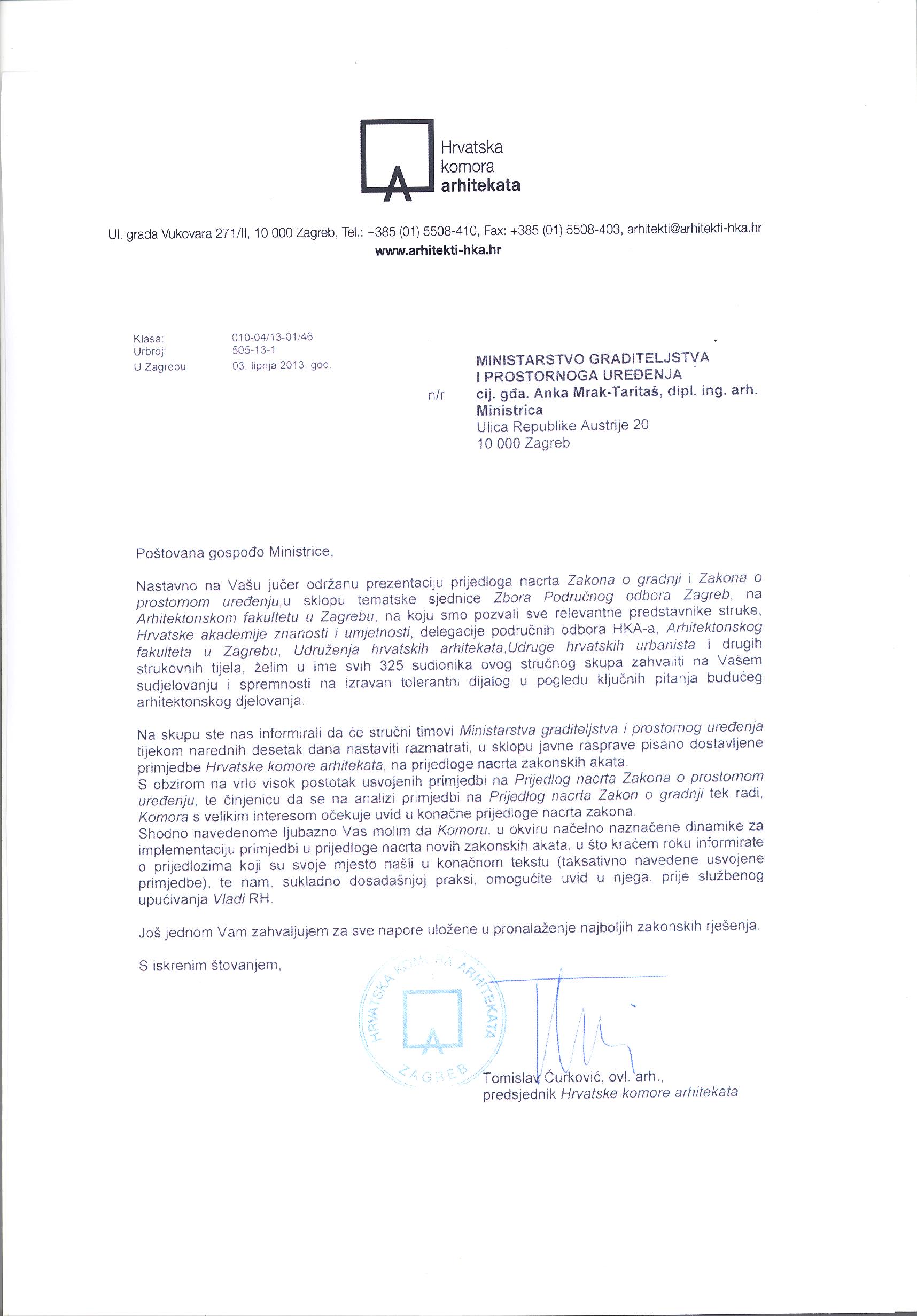 Na skupu ste nas informirali da će stručni timovi Ministarstva graditeljstva i prostornog uređenja tijekom narednih desetak dana nastaviti razmatrati, u sklopu javne rasprave pisano dostavljene primjedbe Hrvatske komore arhitekata, na prijedloge nacrta zakonskih akata. S obzirom na vrlo visok postotak usvojenih primjedbi na Prijedlog nacrta Zakona o prostornom uređenju, te činjenicu da se na analizi primjedbi na Prijedlog nacrta Zakon o gradnji tek radi, Komora s velikirn interesorn očekuje uvid u konačne prijedloge nacrta zakona.