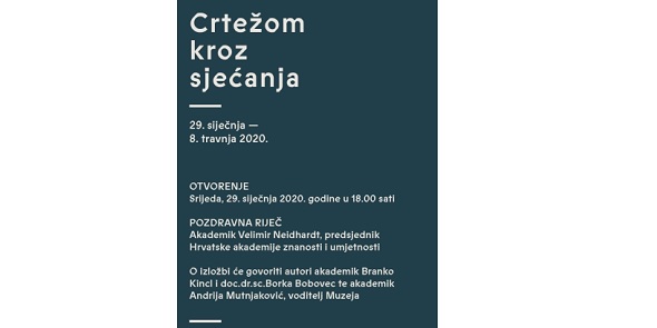 Pozivamo Vas na otvorenje izložbe "Crtežom kroz sjećanja" koje će se održati u srijedu 29. siječnja 2020. s početkom u 18:00 sati u Hrvatskom muzeju arhitekture HAZU. Pozdravnu riječ uputit će akademik Velimir Neidhardt, predsjednik Hrvatske akademije znanosti i umjetnosti. O izložbi će govoriti autori, akademik Branko Kincl i doc. dr. sc. Borka Bobovec, te akademik Andrija Mutnjaković, voditelj Muzeja.