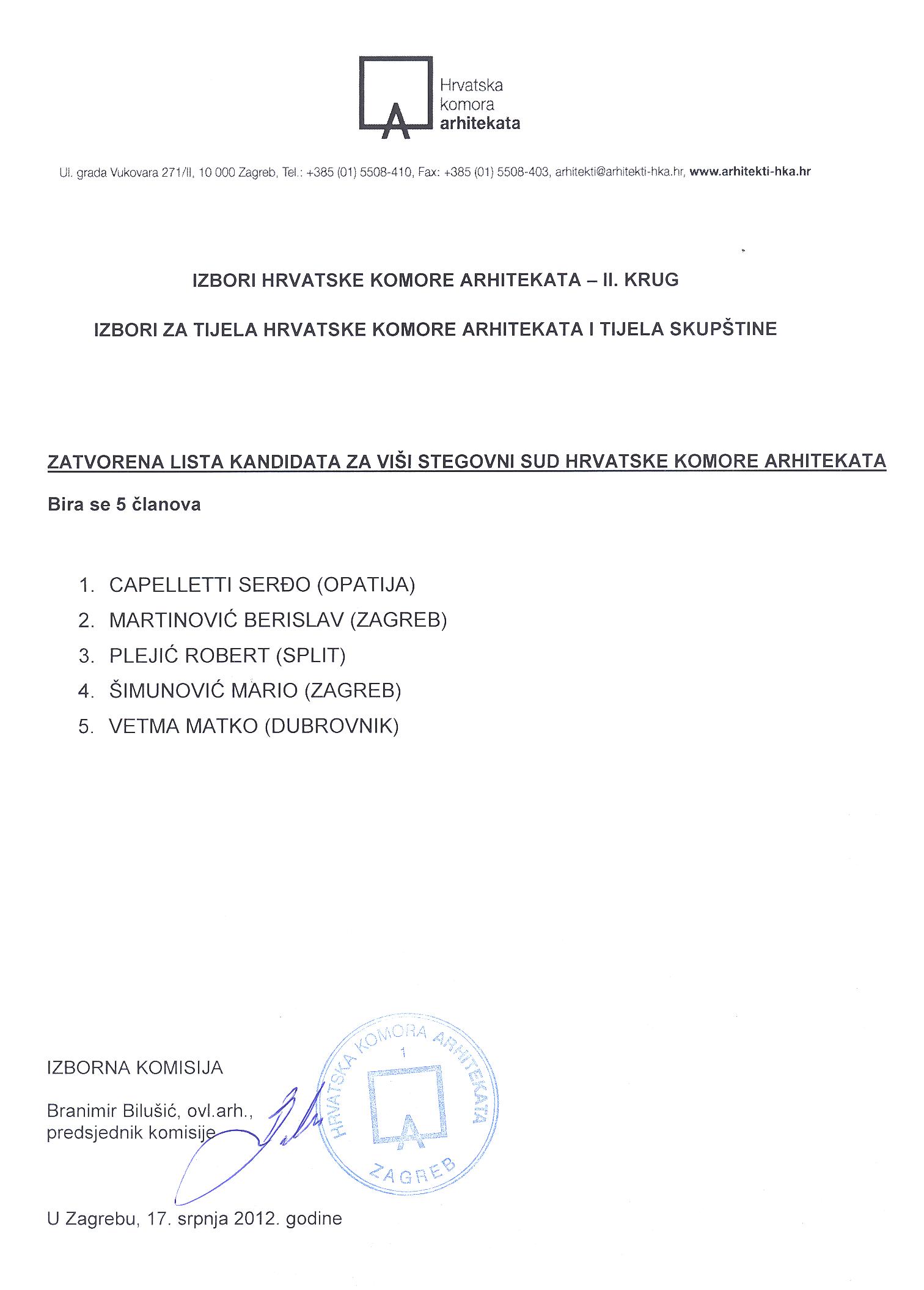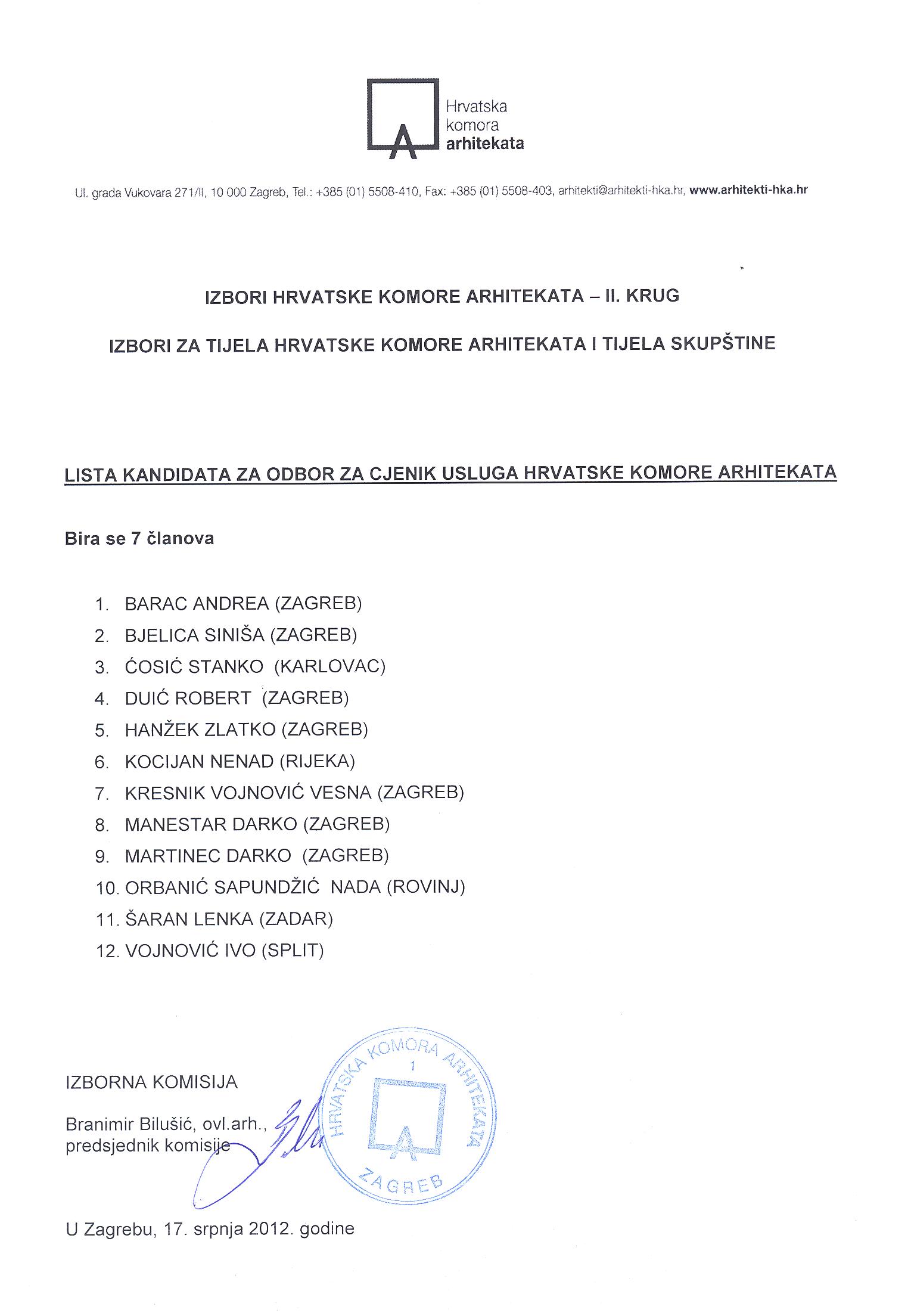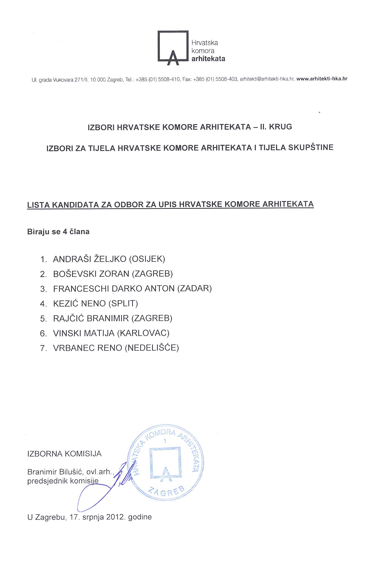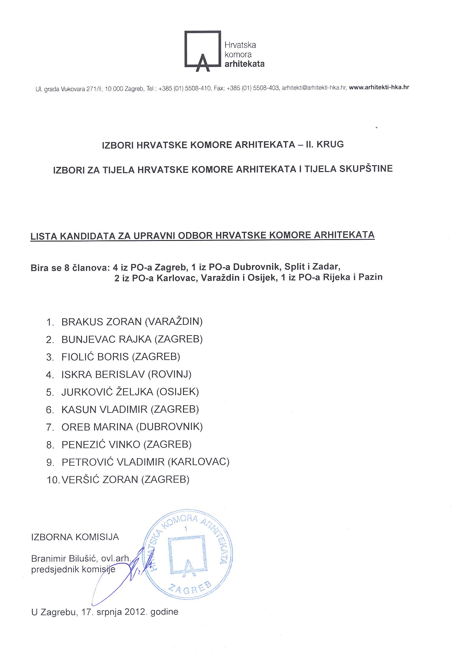 Nakon završenog kandidacijskog postupka za izbor članova tijela Hrvatske komore arhitekata i tijela Skupštine, Izborna komisija je utvrdila slijedeće liste kandidata: