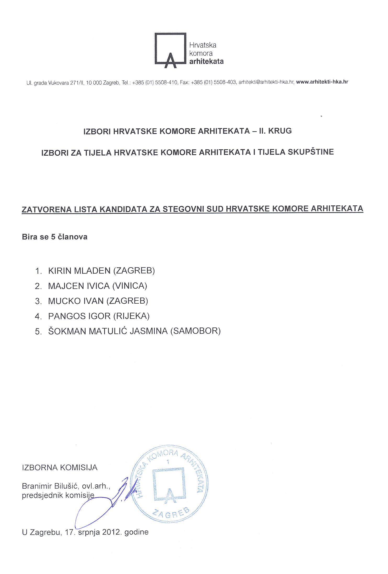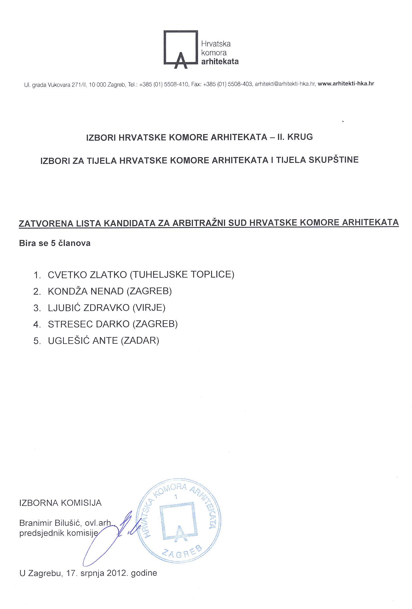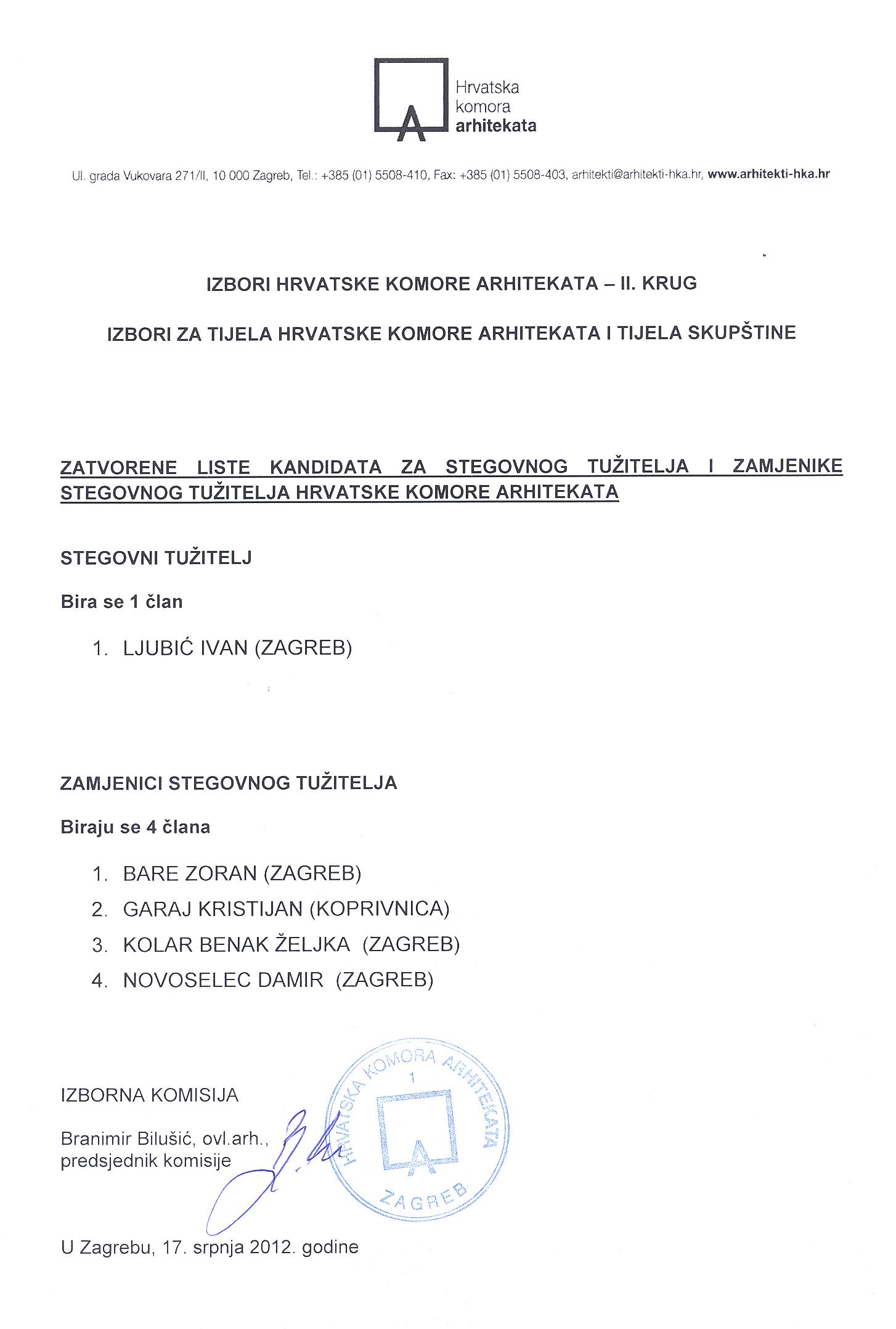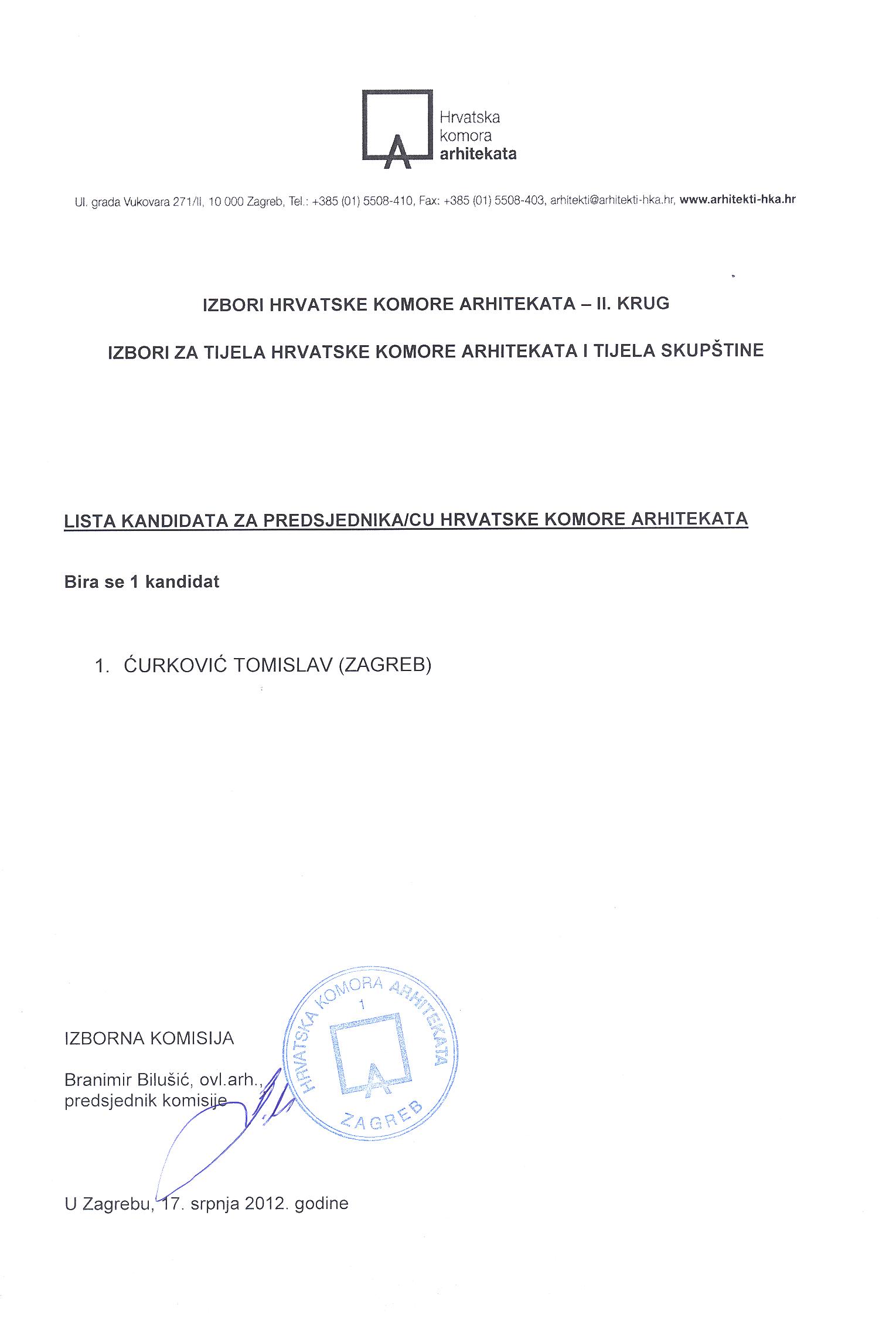 Nakon završenog kandidacijskog postupka za izbor članova tijela Hrvatske komore arhitekata i tijela Skupštine, Izborna komisija je utvrdila slijedeće liste kandidata: