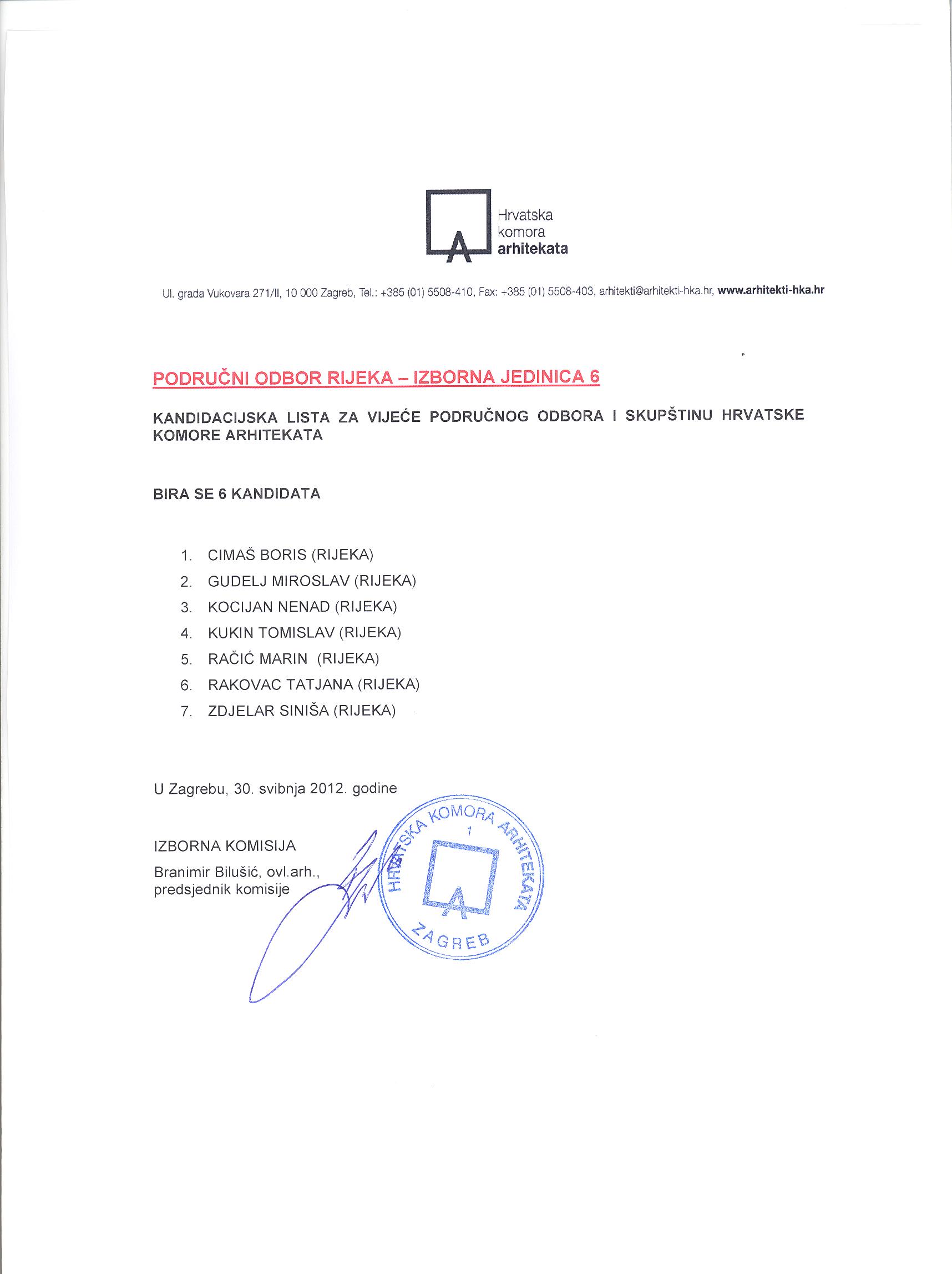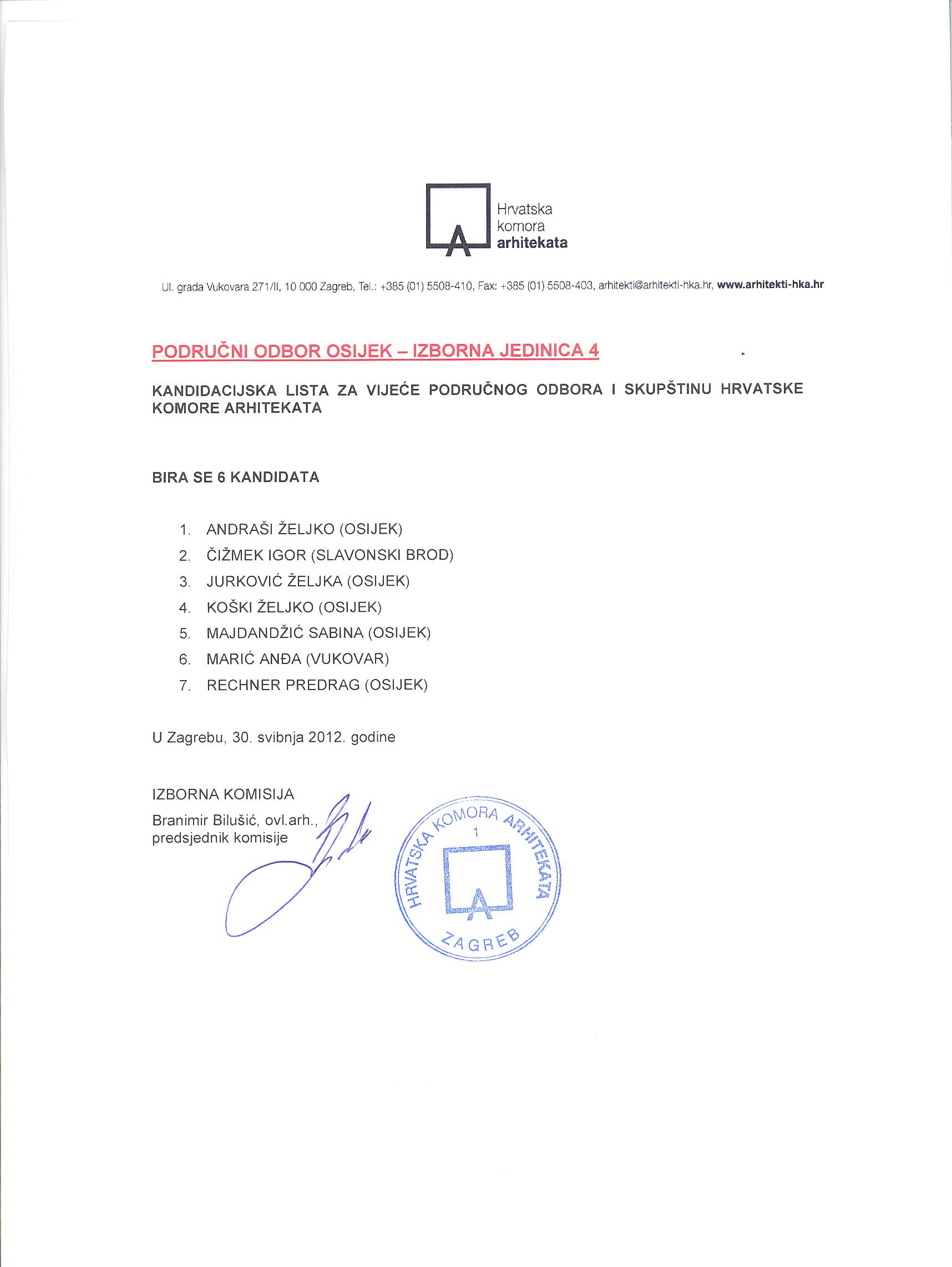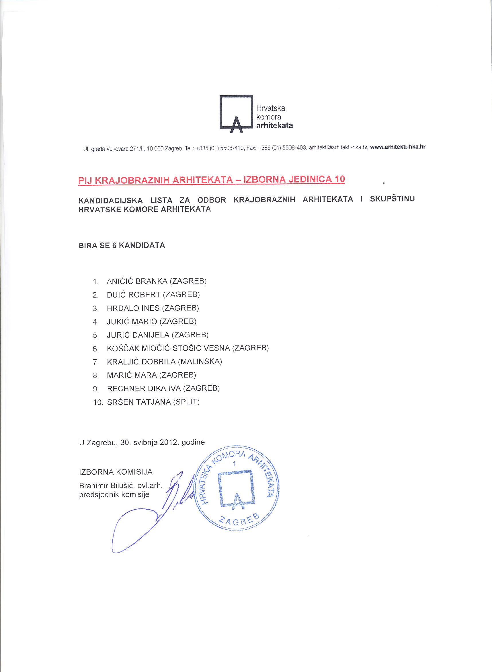 na temelju članka 36. st. 6. Statuta Hrvatske komore arhitekata ("Narodne novine", br. 131/10, pročišćeni tekst) i članka 11. st. 2. Pravilnika o izborima HKA, Izborna komisija objavljuje kandidacijske liste za Vijeća Područnih odbora i Skupštinu Hrvatske komore arhitekata: