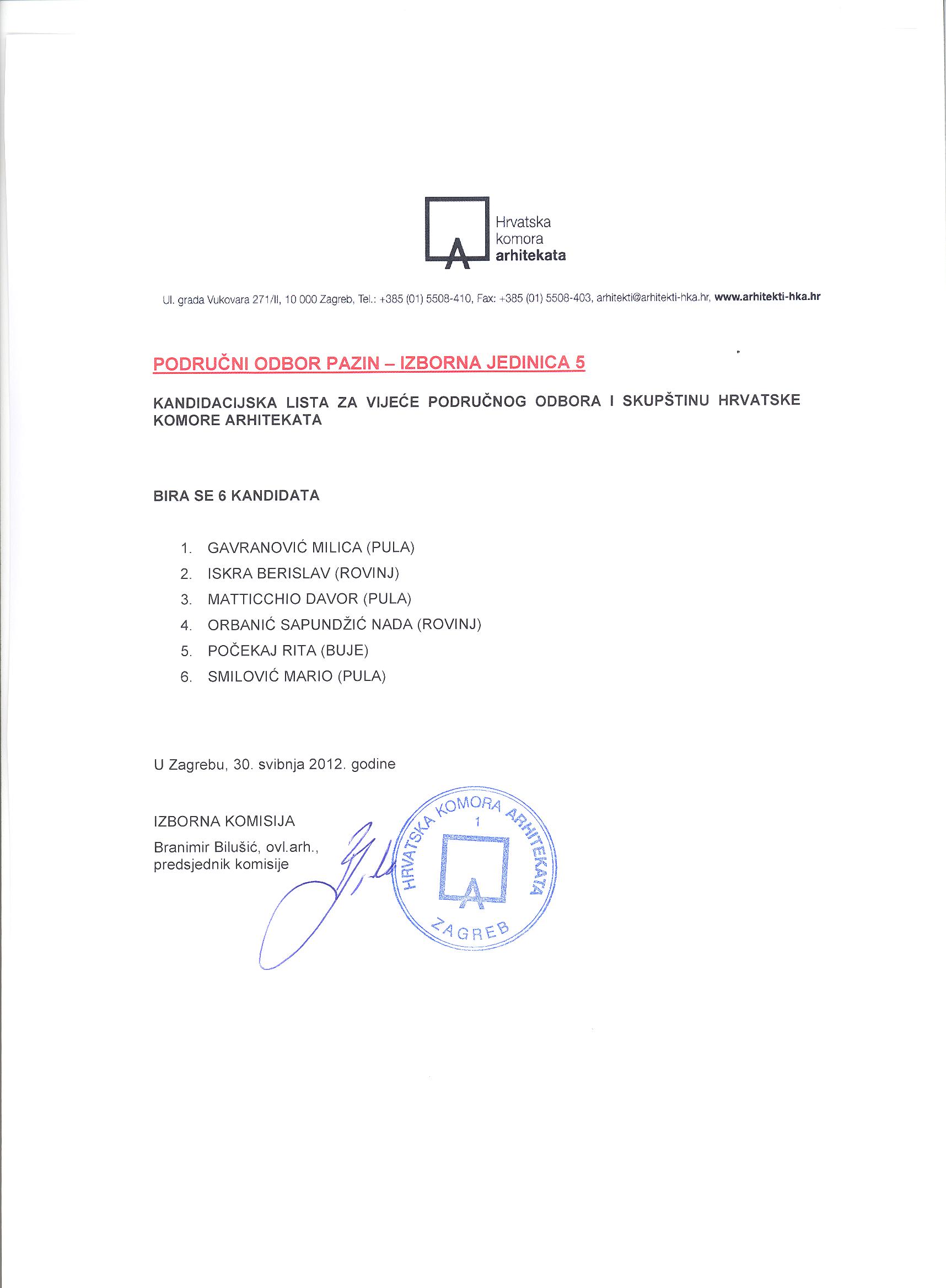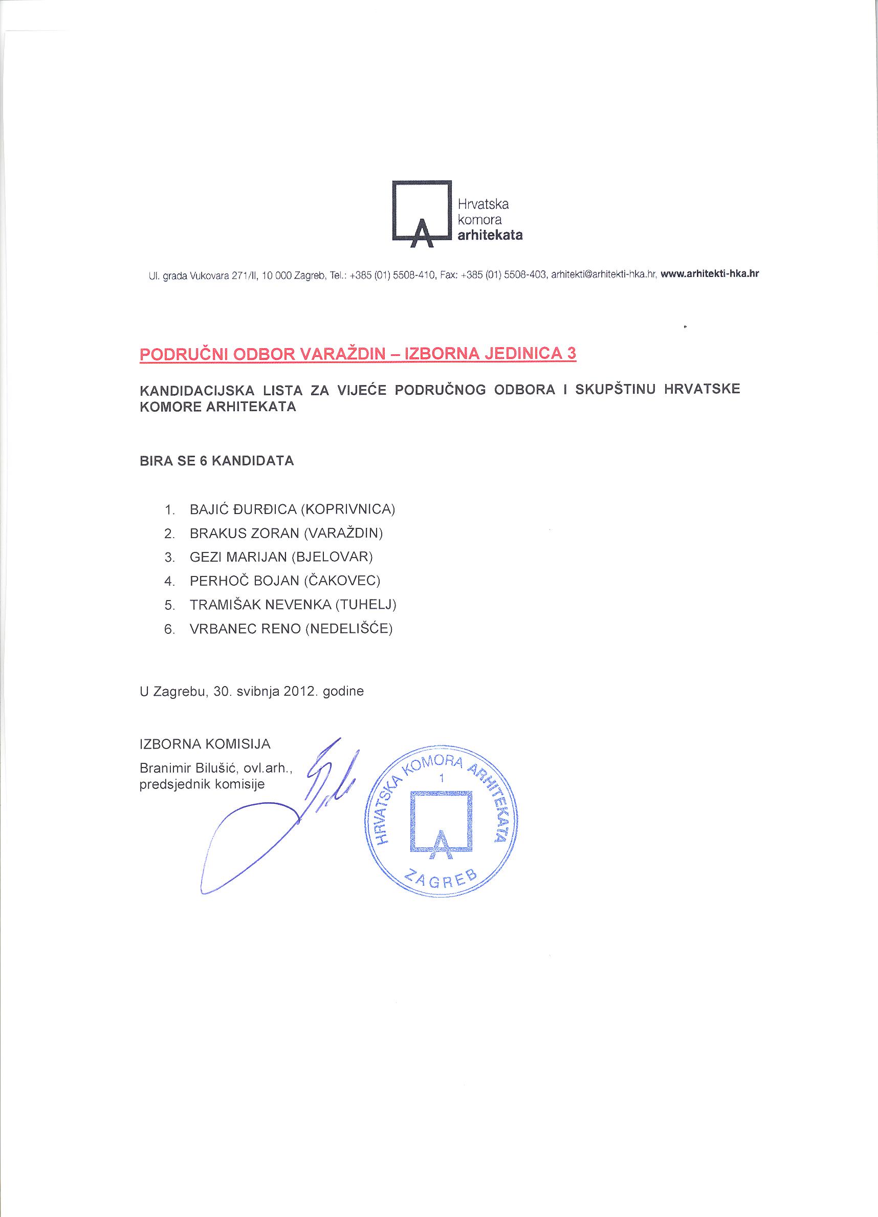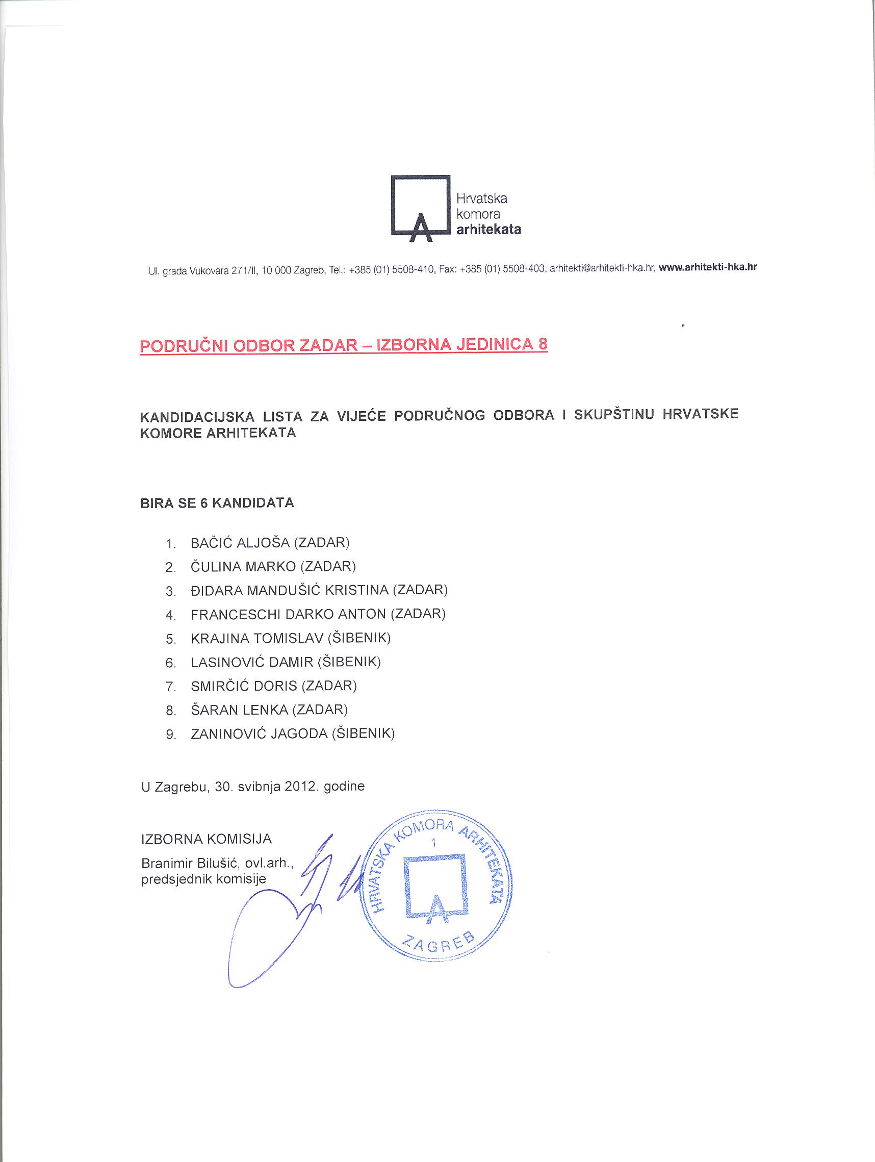 na temelju članka 36. st. 6. Statuta Hrvatske komore arhitekata ("Narodne novine", br. 131/10, pročišćeni tekst) i članka 11. st. 2. Pravilnika o izborima HKA, Izborna komisija objavljuje kandidacijske liste za Vijeća Područnih odbora i Skupštinu Hrvatske komore arhitekata: