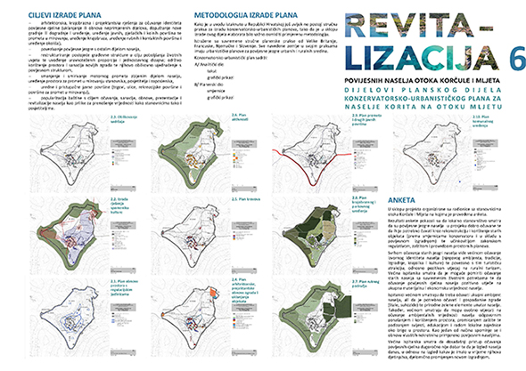 te valorizacijom pojedine utvrđene zone, Konzervatorsko-urbanistički plan za dva pilot područja kulturno-povijesne cjeline naselja Postrana (Žrnovo) na Korčuli i kulturno-povijesne cjeline naselja Korita na Mljetu kao i brošuru „Revitalizacija povijesnih naselja otoka Korčule i Mljeta“ kojom se želi stanovnike otoka osvijestiti o vrijednostima kraja u kojem žive, kao i investitore koji u taj kraj žele investirati. Izrada metodologije za specifičnu, prijeko potrebnu kategoriju planova, konzervatorsko-urbanistički plan, važan je iskoraku planiranju prostora jer neizravno ukazuje na činjenicu potrebe detaljnijeg i drugačijeg sagledavanja kulturno povijesnih cjelina, koji mora postati standard kako stručni tako i zakonski.