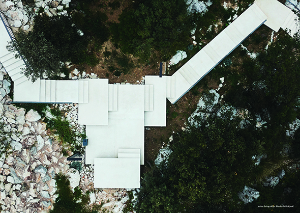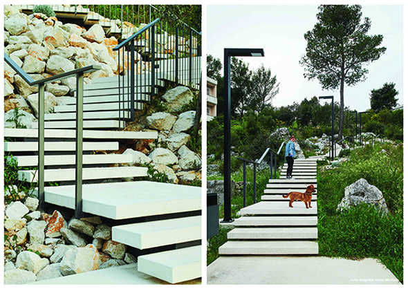 Čelična ograda pomno je promišljena tako da bude samo na pozicijama gdje je doista potrebna, u pravilu samo s jedne strane kraka. Druga je strana stubišta slobodna, bez granica s terenom. Ako bi čovjek poželio, mogao bi se jednom rukom držati za rukovat, a drugom dodirivati škrapu ili mirisni ružmarin.