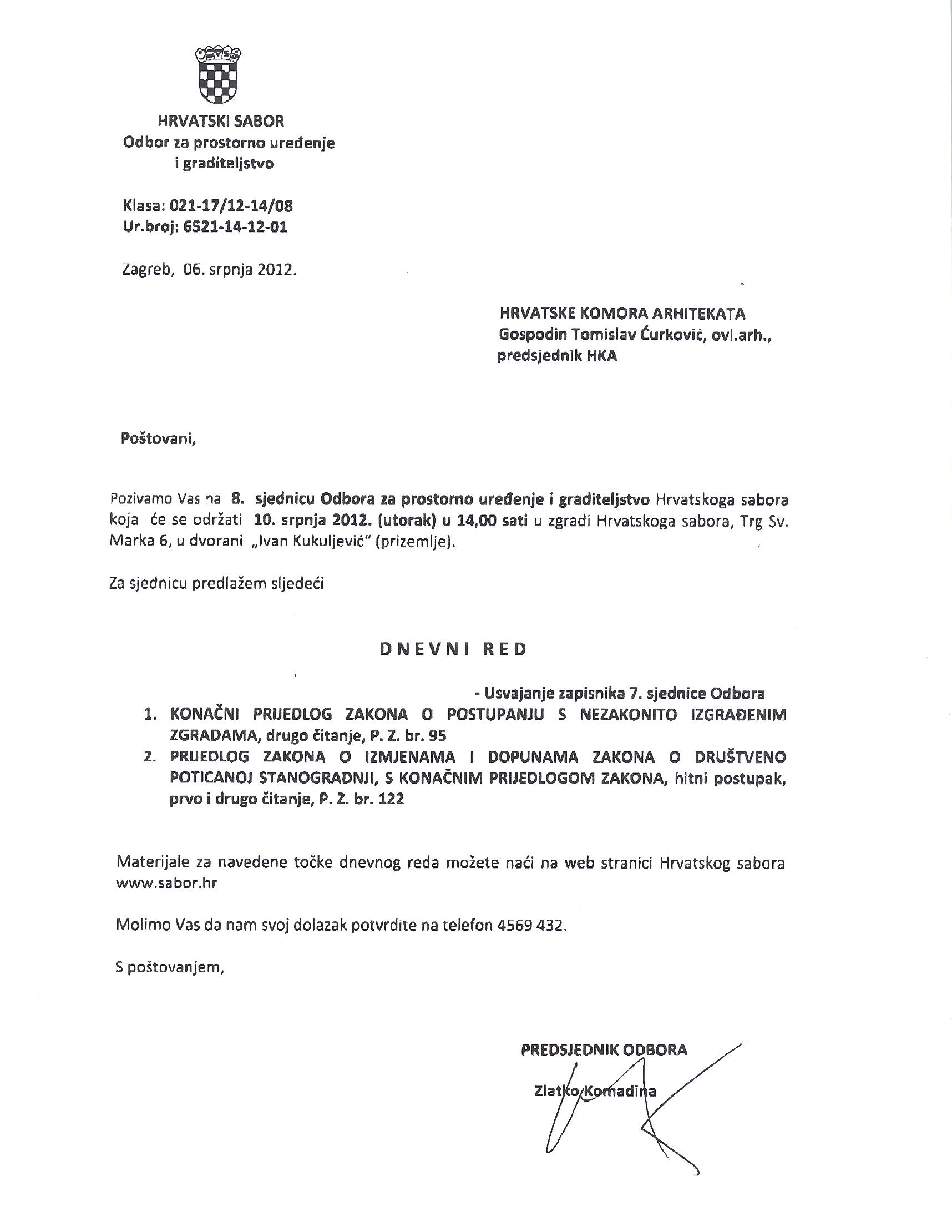 Objavljujemo odgovor Odbora za prostorno uređenje i graditeljstvo Hrvatskog sabora na očitovanje Hrvatske komore arhitekata na Prijedlog Zakona o postupanju s nezakonito izgrađenim zgradama i poziv na sjednicu Odbora: