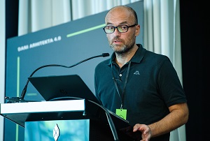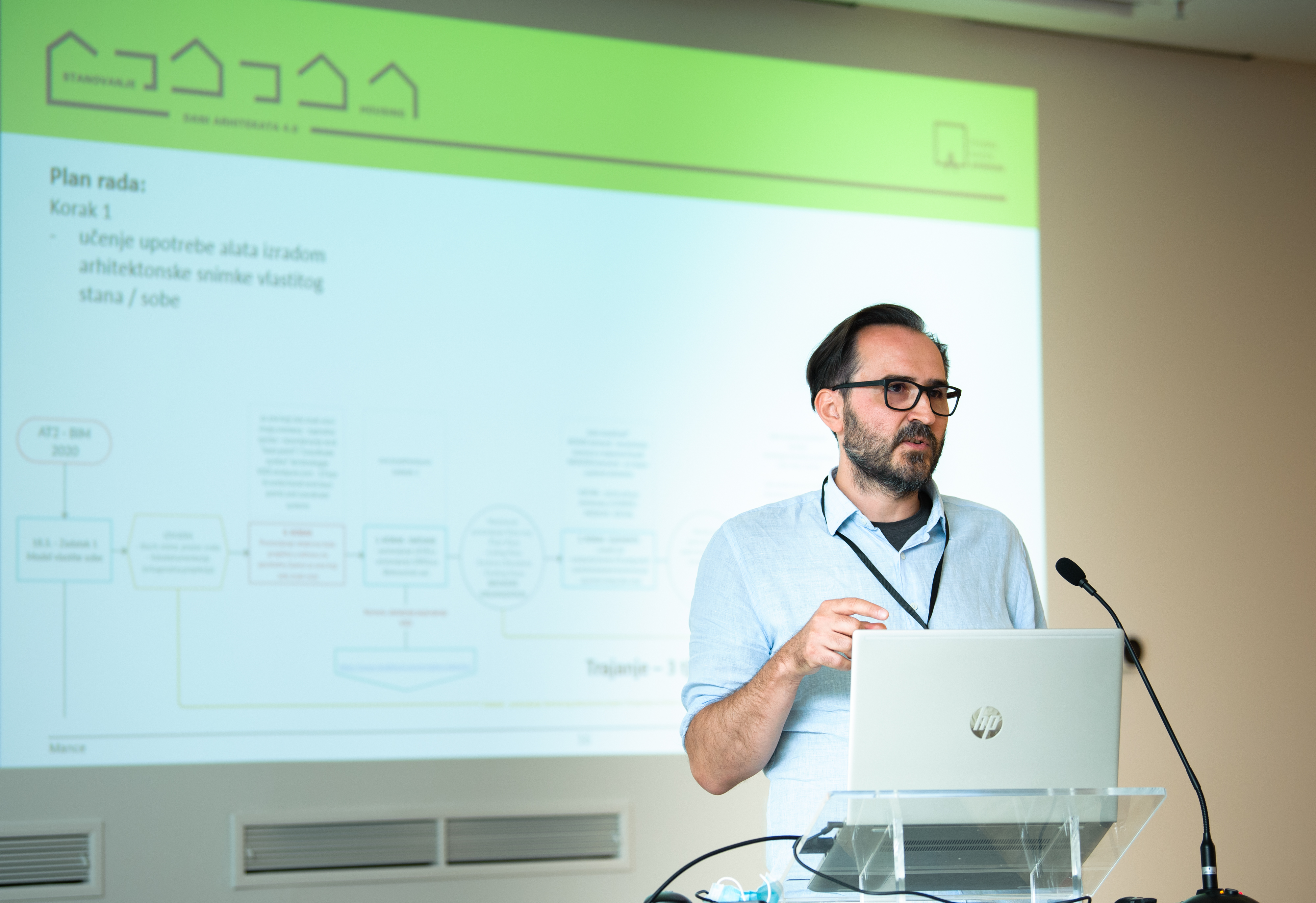 Uvodničar sesije BIM-a, Marin Račić, arhitekt iz ureda MR2 iz Rijeke. HKA nastavlja promovirati napredne BIM tehnologije jer jedino primjenom najnovijih tehnoloških rješenja hrvatski projektanti mogu pratiti svjetske trendove i praksu. Širenje fokusa primjene BIM-a s projektiranja na druge faze u procesu gradnje vidljivo je kroz realizaciju uspješnih projekata u Hrvatskoj. Uloga HKA je osigurati članovima potporu u tim procesima.