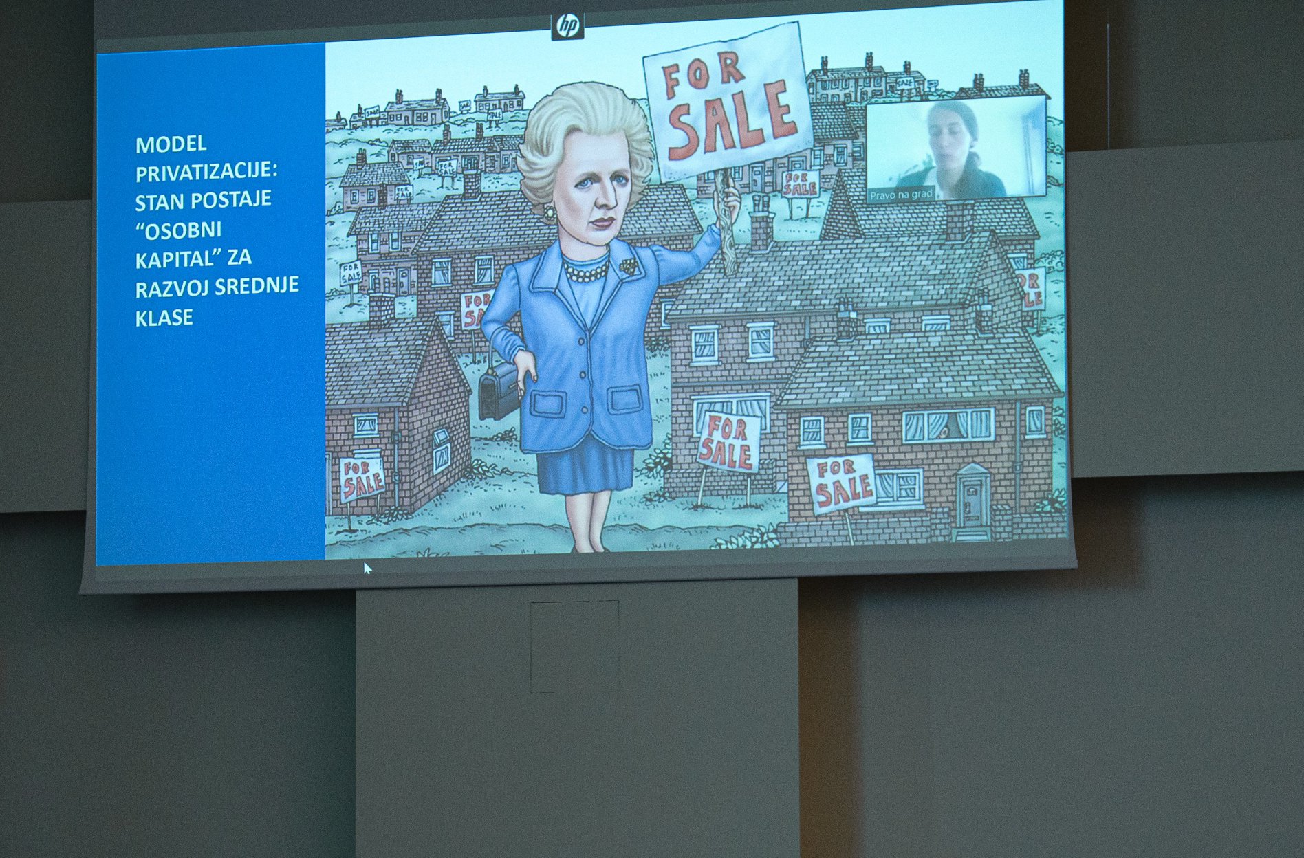 Iva Marčetić iz organizacije Pravo na grad organizacija koja se na različite načine bavi urbanom pravdom u najširem smislu, video linkom predstavila je teze kako pravo na grad uključuje i pravo na stanovanje.