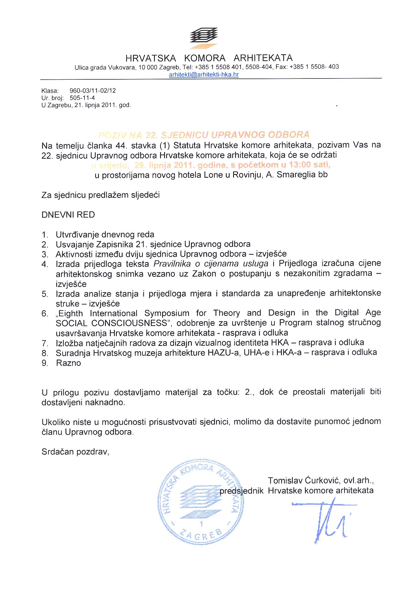 Obavještavamo Vas da će se u srijedu, 29. lipnja 2011. godine, s početkom u 13.00 sati, u prostorijama novog hotela Lone u Rovinju, A.Smareglia bb, održati 22. sjednica Upravnog odbora HKA.
