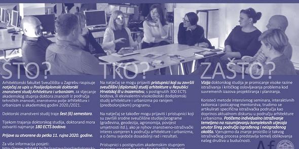 Arhitektonski fakultet Sveučilišta u Zagrebu raspisuje natječaj za upis u Poslijediplomski doktorski znanstveni studij Arhitektura i urbanizam, za stjecanje akademskog stupnja doktora znanosti iz područja tehničkih znanosti, znanstveno polje arhitektura i urbanizam u akademskoj godini 2020./2021.