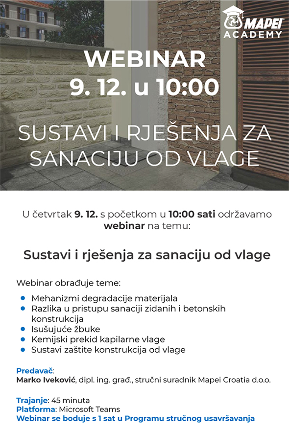Sustavi i rješenja za sanaciju od vlage - MAPEI webinar / četvrtak, 9.12.2021. u 10 sati