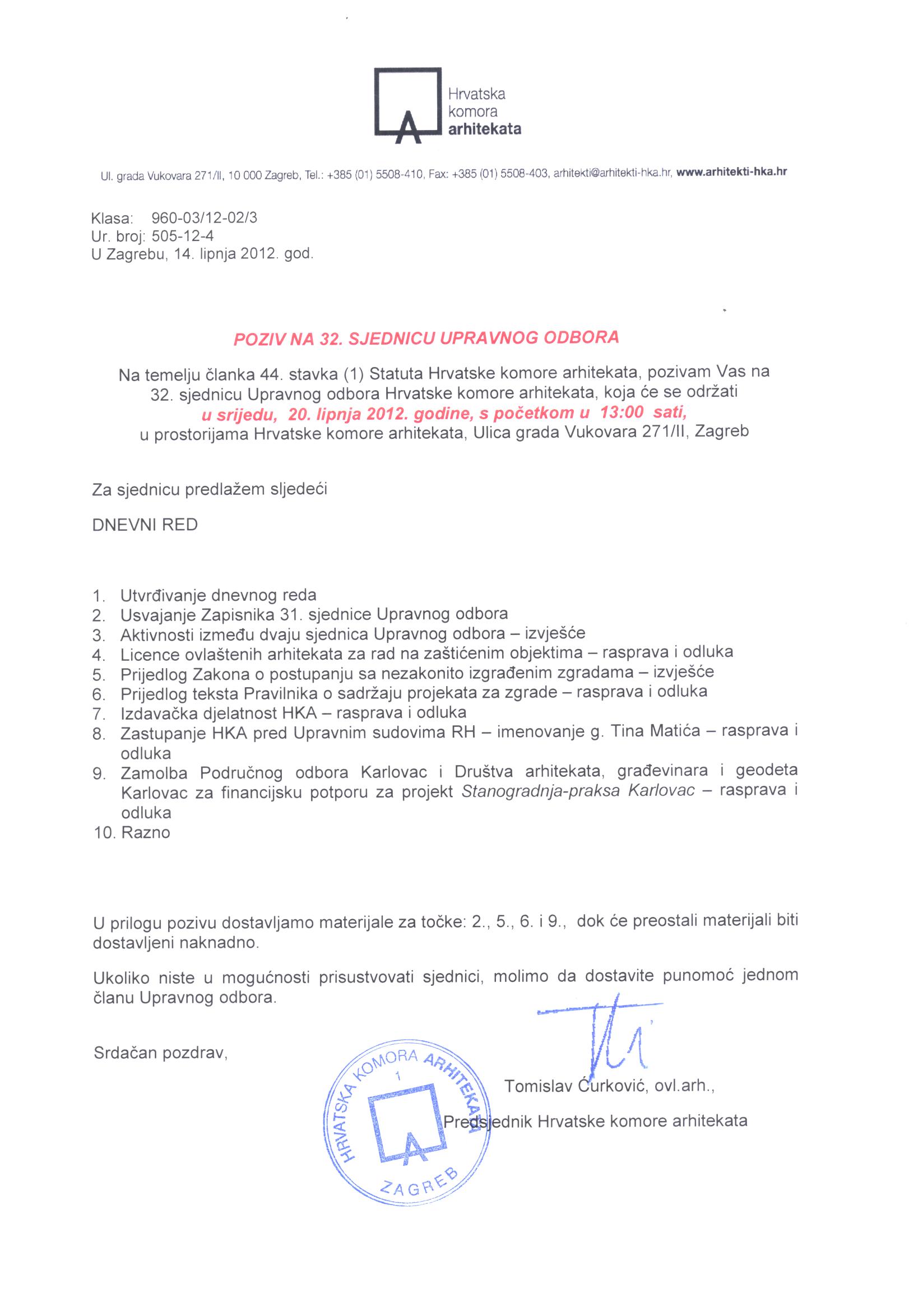 Obavještavamo Vas da će se u srijedu, 20. lipnja 2012. godine, s početkom u 13.00 sati, u prostorijama Hrvatske komore arhitekata, održati 32. sjednica Upravnog odbora.