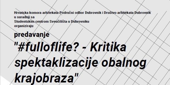 rasprave i odgovore. U predavanju pod naslovom “#fulloflife? - Kritika spektaklizacije obalnog krajobraza”, iz perspektive mladih stručnjaka s područja planiranja, oblikovanja i produkcije pejzaža, ponuditi ćemo svoje tumačenje spomenutih procesa i njihovih implikacija na periurbani i ruralni prostor. Cilj nam je također, zajedno s publikom i članovima lokalne zajednice, promisliti alternativne modele, metode i pristupe njegovog uređenja, korištenja i upravljanja. Ako je među strukom i zainteresiranom javnosti već ustanovljen konsenzus kako se radi o našem najvećem resursu i zajedničkom dobru, onda je vrijeme da krenemo djelovati.