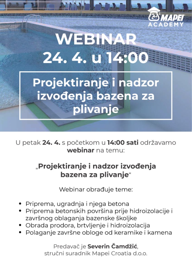 najavljuje webinar tvrtke Mapei Projektiranje i nadzor izvođenja bazena za plivanje